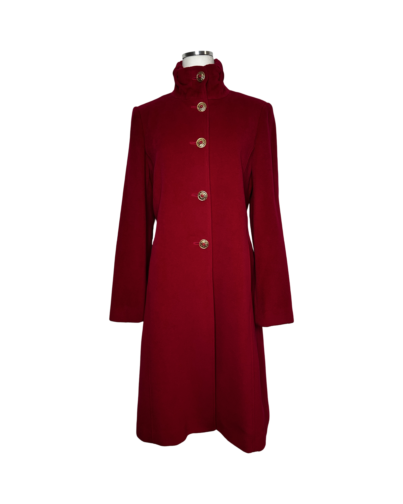 Made in red Angora Button up fascinating. Gold tone metal buttons with engraving and red dome to centers, lining, yellow trim along interior, two side pockets.